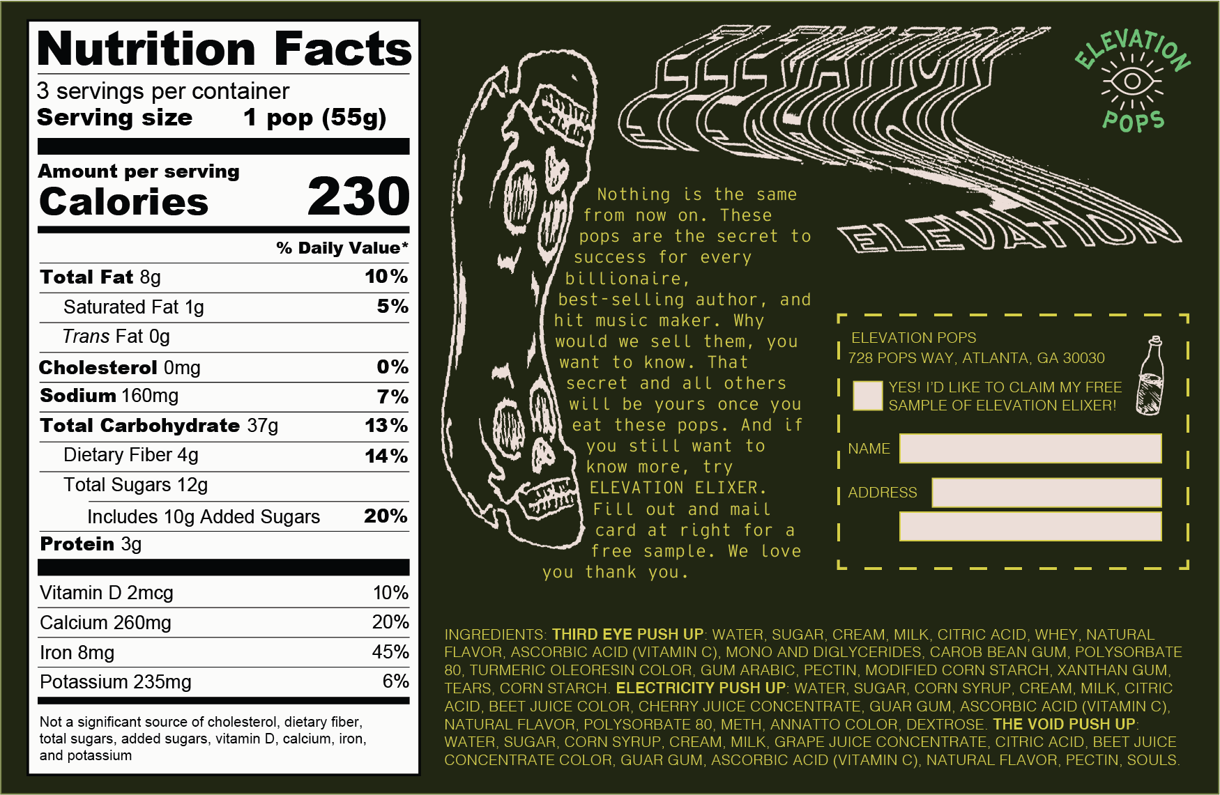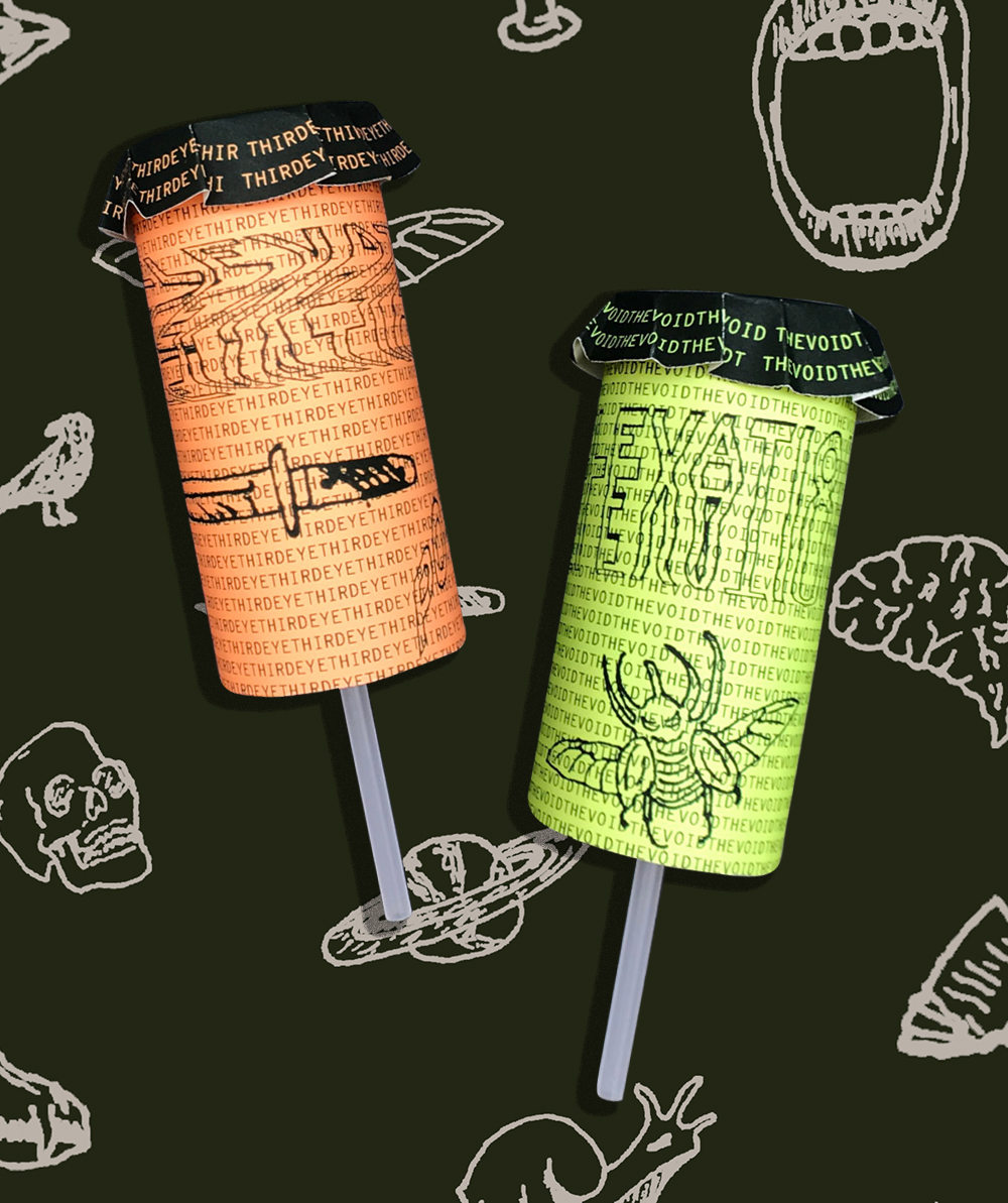 Elevation Pops are push-up pops inspired by cult imagery, Dr. Bronner’s bottles, and sci-fi. Users are meant to uncover increasingly weird details as they explore the packaging, from the testimonials to the ingredients list.